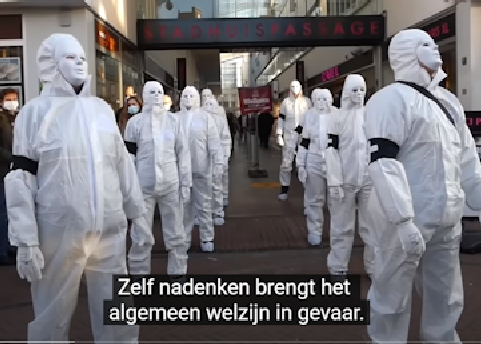 Een ludieke protestactie tegen de disproportionele corona maatregelen. Op de beat van voetstappen werden deze ‘slaven’ door speakers begeleid waaruit een vrouwelijke robotstem schalde die teksten uitsprak als: ‘Zelf nadenken brengt het algemeen welzijn in gevaar’ ‘Mondkapjesplicht een leven lang’ ‘Vaccinatie tegenstanders hun rechten ontnemen’ ‘Lichaamscontact veroorzaakt leed’ ‘Alleen eenzaamheid is veilig’ ‘Wees altijd gehoorzaam’ ‘Vaccinatie is naastenliefde’ ‘Vermijd voor altijd nabijheid’ Veel toeschouwers bleven staan om het schouwspel te bekijken. Sommige toeschouwers fluisterden: ‘Ja, hier gaan we naar toe, verschrikkelijk.” Anderen liepen stoïcijns voorbij. … v … Als tegengeluid tegen de corona maatregelen die volgens de deelnemers de toekomst van onze wereld een heel stuk minder menselijk maakt …